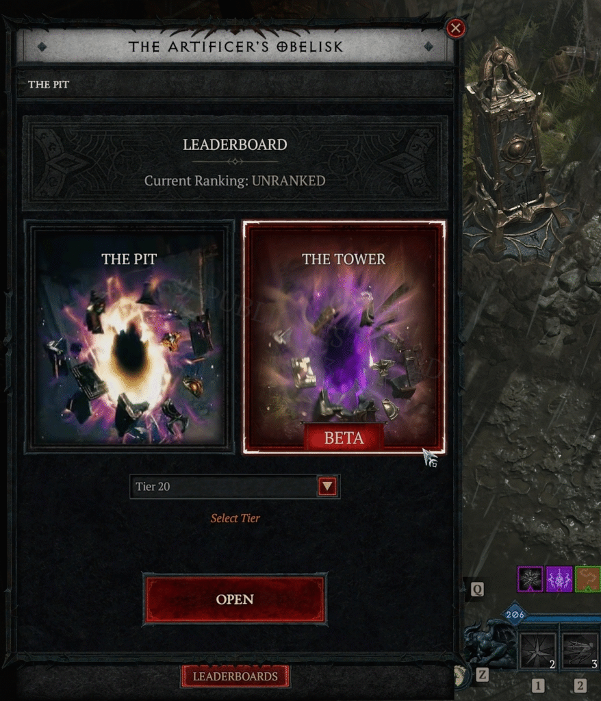 Players can unlock The Tower by completing the Hellish Decent Capstone Dungeon at Season Rank 2 of the Season Journey. Once unlocked, you can access The Tower at The Artificer’s Obelisk in Cerrigar. You may select any difficulty tier that you have previously unlocked in The Pit, and new difficulty tiers can be unlocked by progressing through The Tower itself.